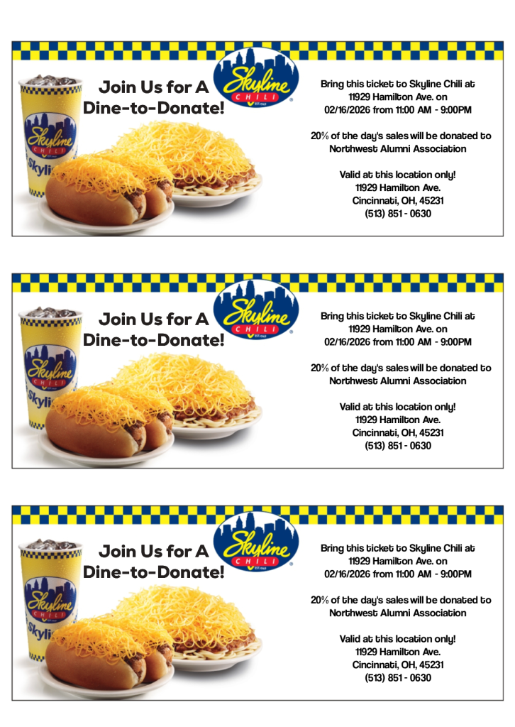 Midwest Skyline Chili will be sponsoring our Alumni Association on February 16, 2026. A portion of all purchases that day will benefit the Association. Come by for a meal or a snack and maybe reconnect with some forgotten friends. A coupon is required. Please print this page and take it to the restaurant with you.